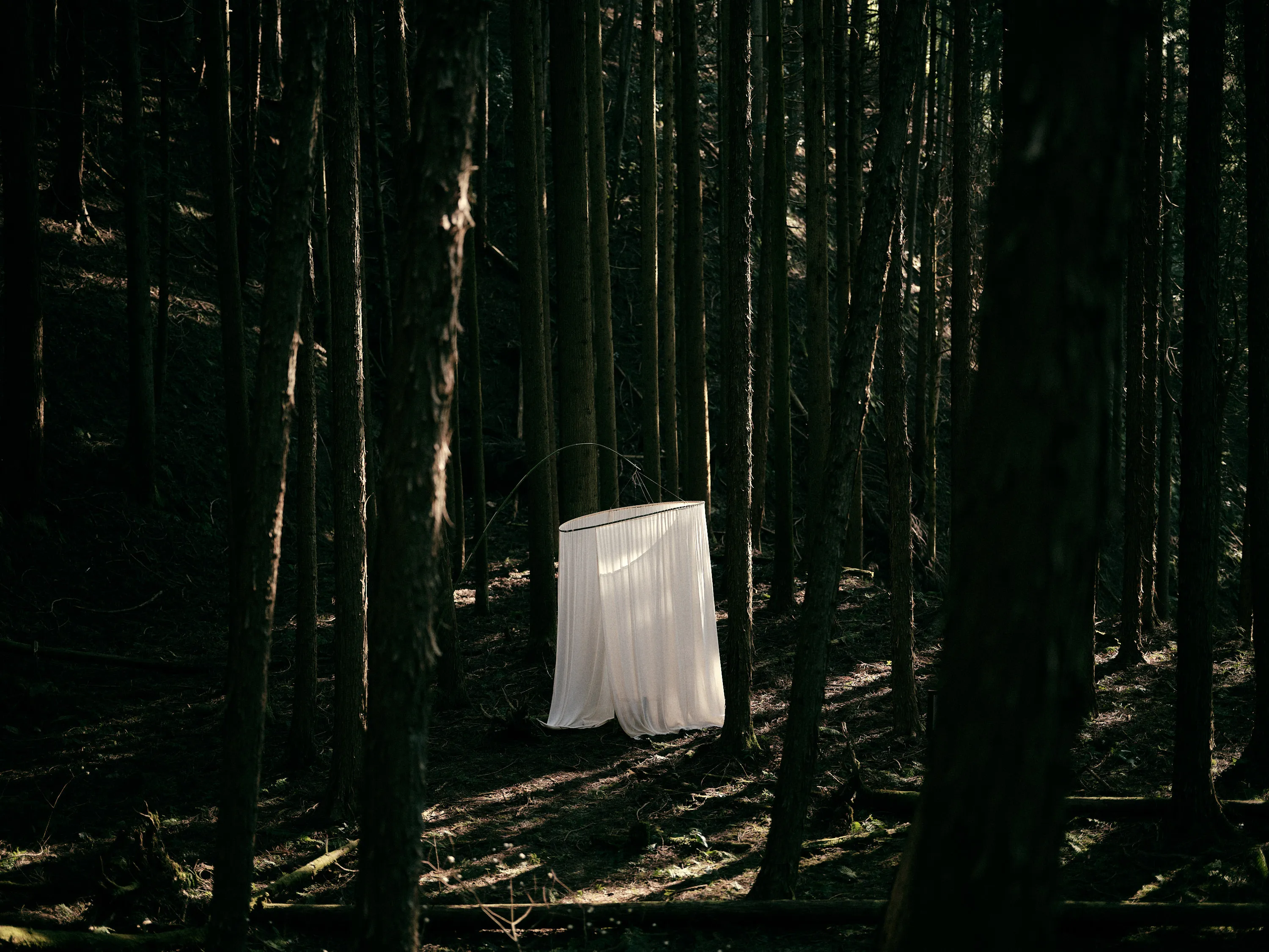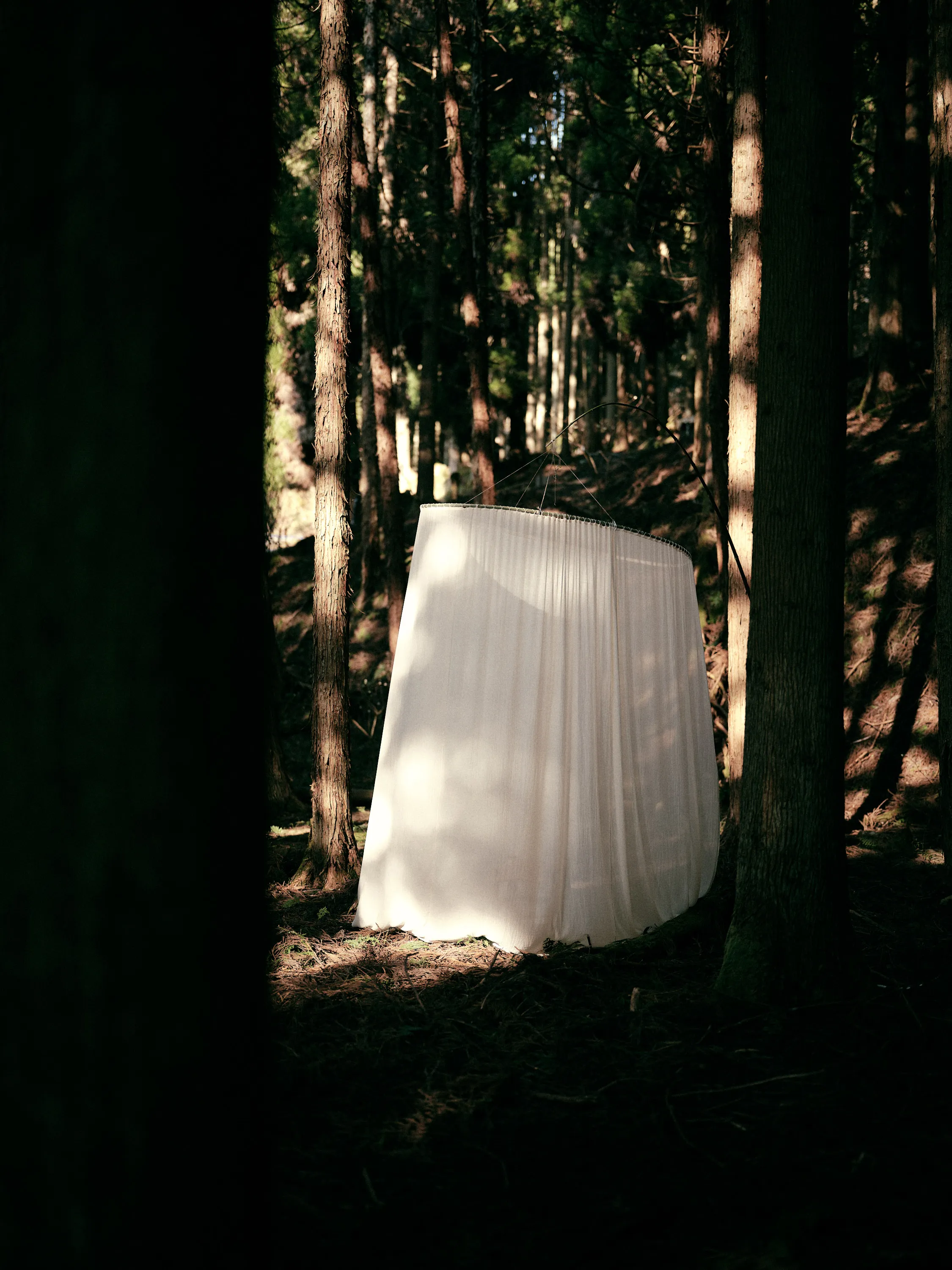 僕は森に入ると、自分の中から、普段は意識していない不思議な感覚が立ち上がって来るような気がしています。それはすっかり飼い慣らされてしまった僕の中の野生なのかもしれません。布を通して「見えないものを見えるようにする」そんなことをいつも考えてデザインをしています。森の展示室では、「みえないことで、みることができる」という逆の発想からアイデアを展開しました。