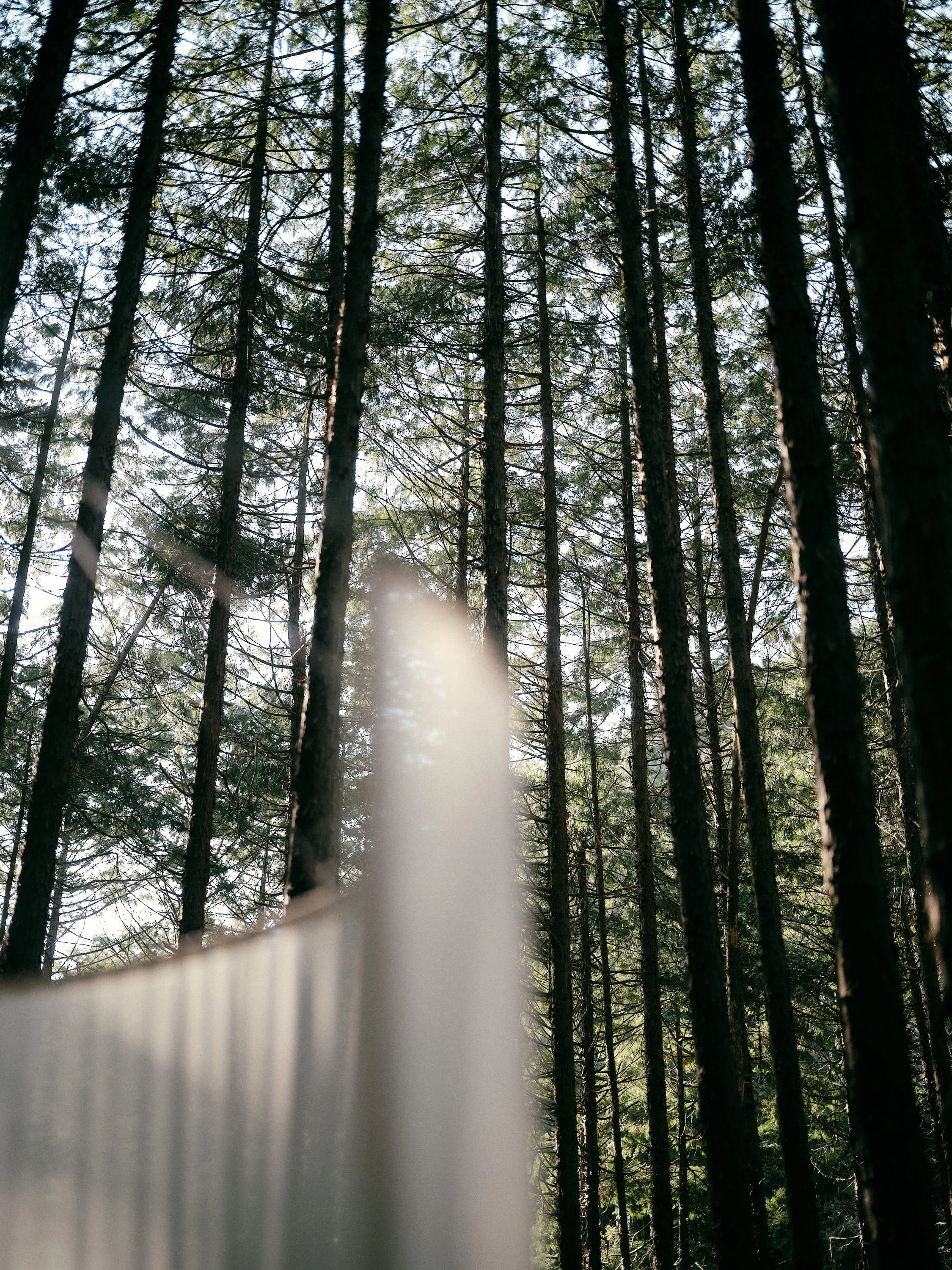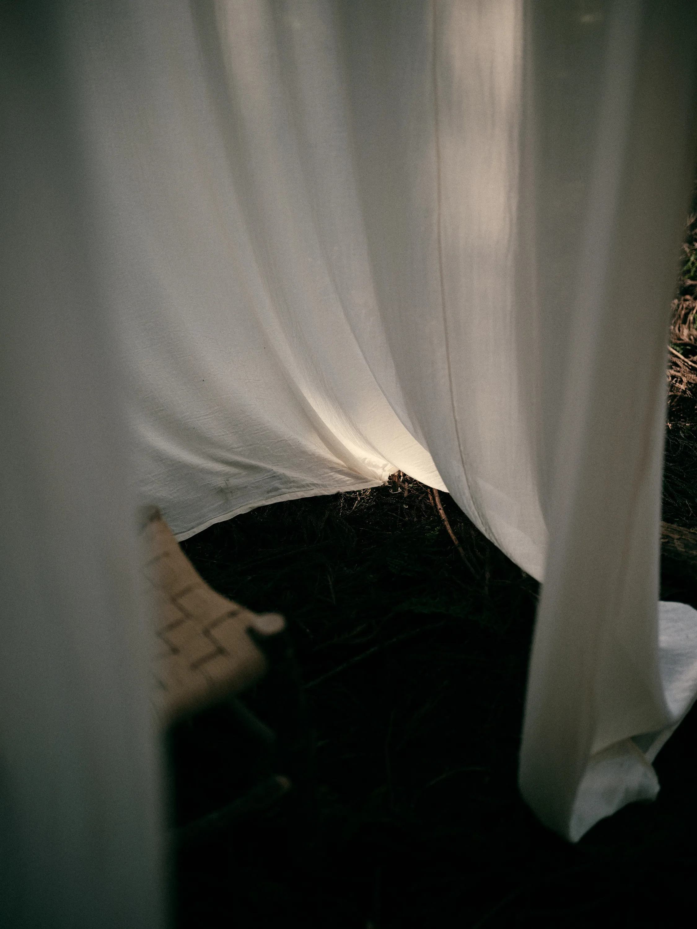 布の中に入ると、視覚のほとんどが遮られます。向こう側がほのかに透ける程度の軽い布ですが、景色の大半は見えなくなります。すると、普段は奥に控えていた感覚が立ち上がってきます。木の葉のざわめき、川の流れる音、鳥の声。湿った土の匂い。風が布を揺らす触感。どれも最初からそこにあったものです。